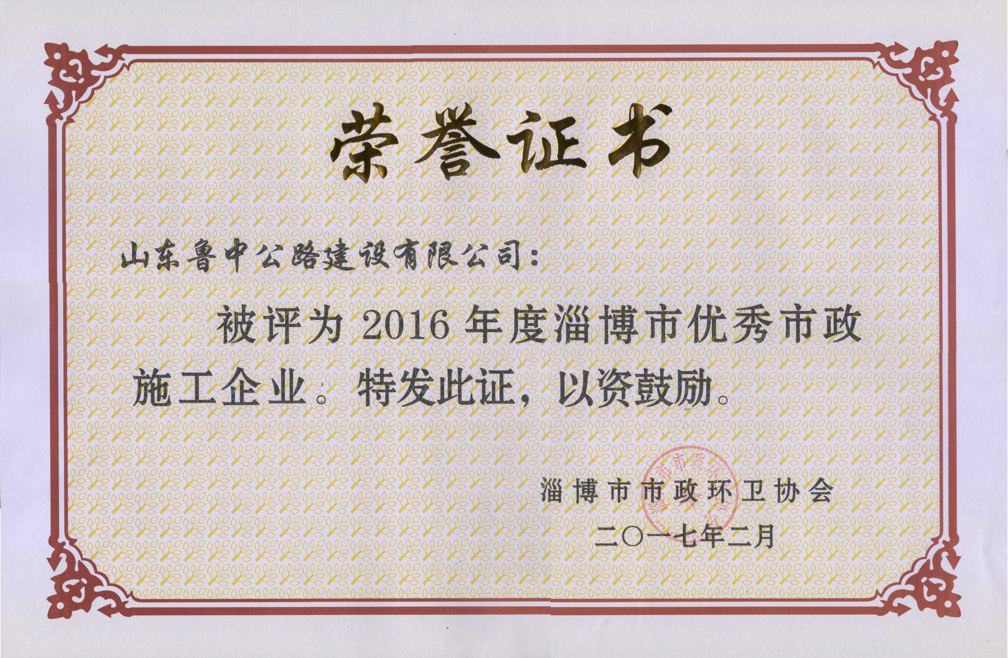 公司被評為2016年度淄博市優(yōu)秀市政施工企業(yè)