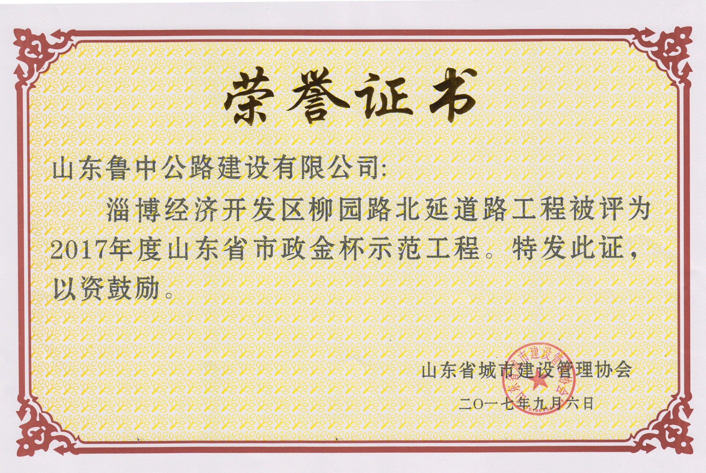 2017年9月6日,山東魯中公路建設有限公司傳來喜訊,淄博經(jīng)濟開發(fā)區(qū)柳園路北延道路工程被評為2017年度山東省市政金杯示范工程。
