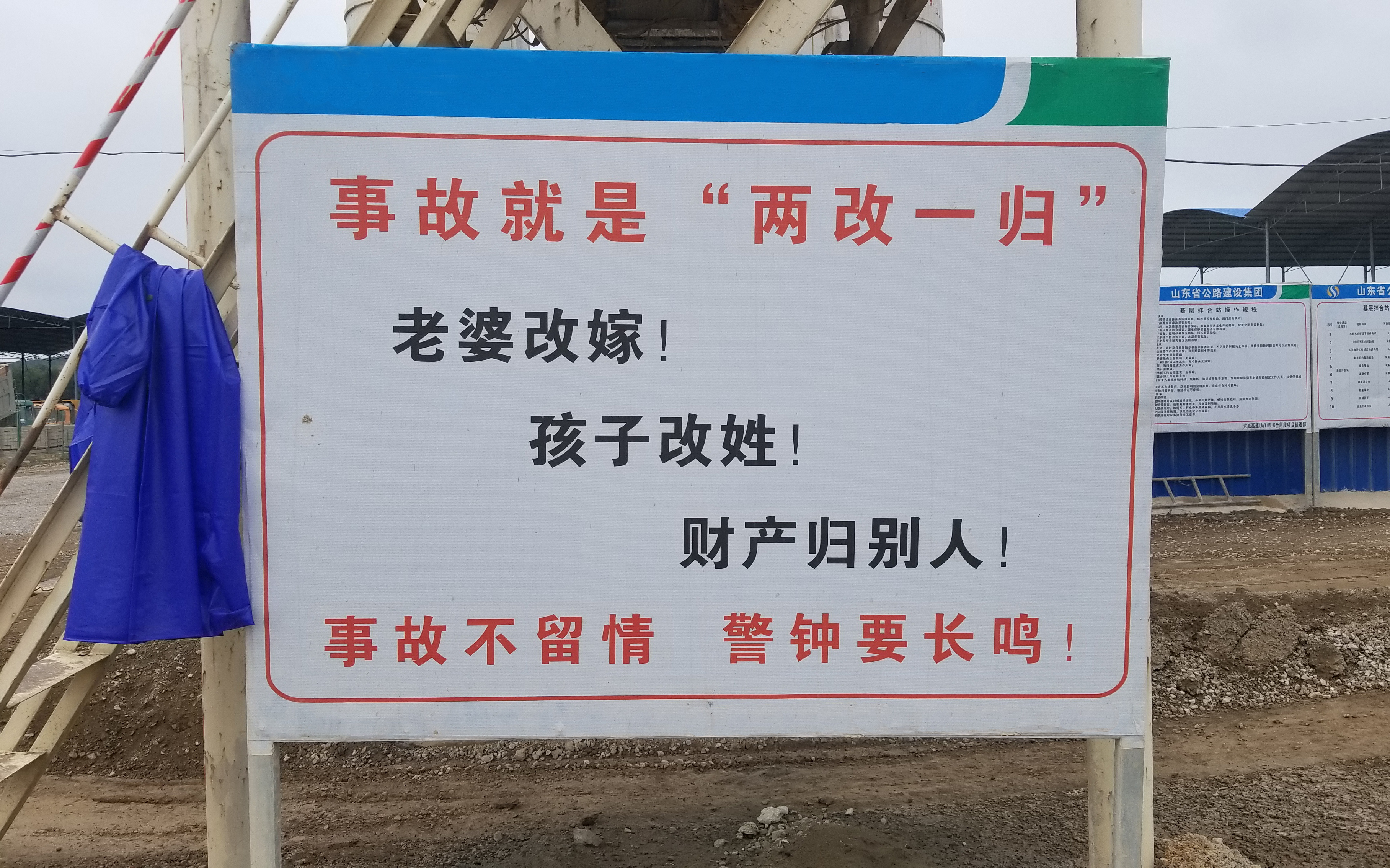 其次,安全,宣傳很重要。在一工區(qū)項(xiàng)目部的拌合站有這樣一個(gè)警示牌:事故后果就是老婆改嫁,孩子改姓,財(cái)產(chǎn)歸別人!當(dāng)時(shí)我記得周圍的人都在取笑這個(gè)警示牌的內(nèi)容,包括我也覺著有點(diǎn)太通俗了點(diǎn)吧??墒乾F(xiàn)在的我并不覺著可笑了,覺著是那么的真實(shí),甚至是可怕。通過宣傳教育,將安全觀念深入每個(gè)人的心里,安全工作才會(huì)真正的起到效果。