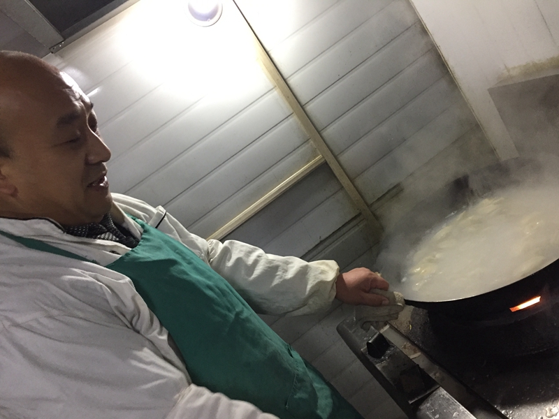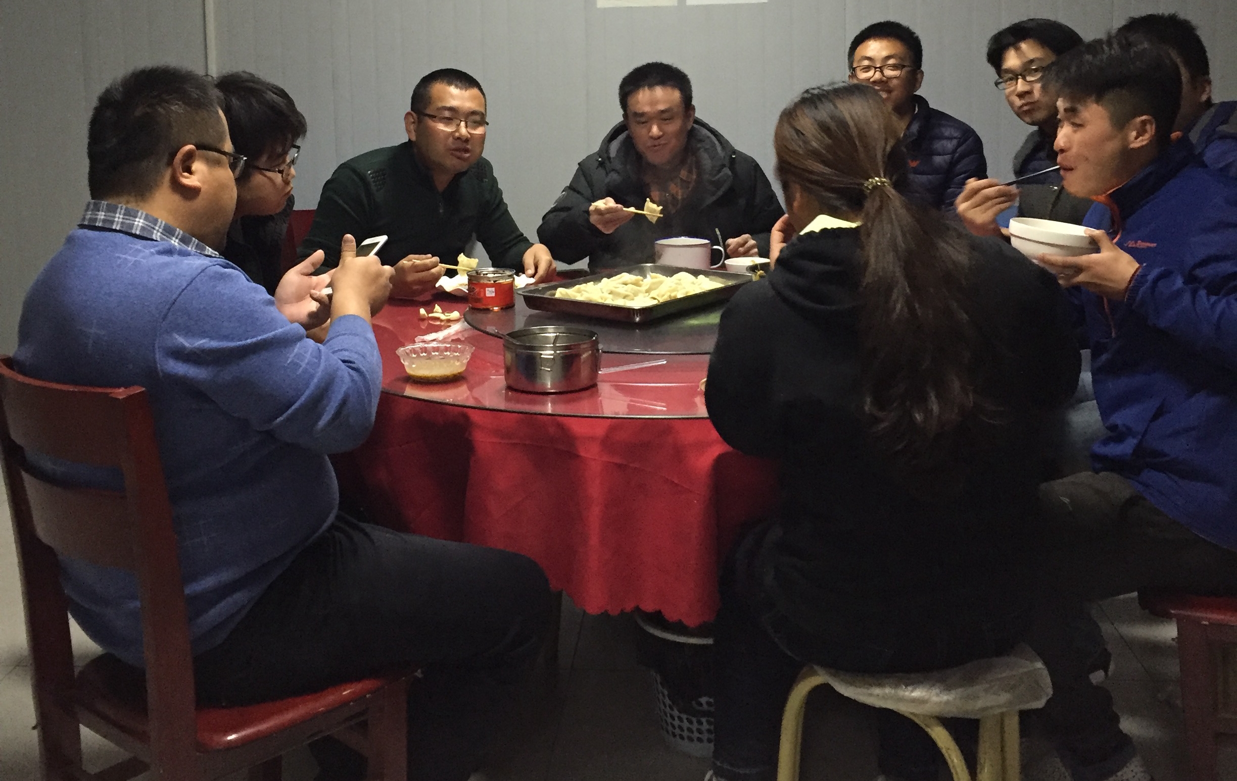 冬天是寒冷的,但這樣一個溫暖的大家庭里讓我們感受到暖暖的春意。一盤盤熱氣騰騰的餃子端上桌了,大家圍坐在桌邊,品嘗著自己的勞動果實、笑談某人包餃子的水平如何。談笑間,夜幕降臨,每個人都拿起手機(jī)與家中的親人表達(dá)節(jié)日的祝福、訴說無法團(tuán)聚的遺憾,和親人分享自己在工地過節(jié)體驗。