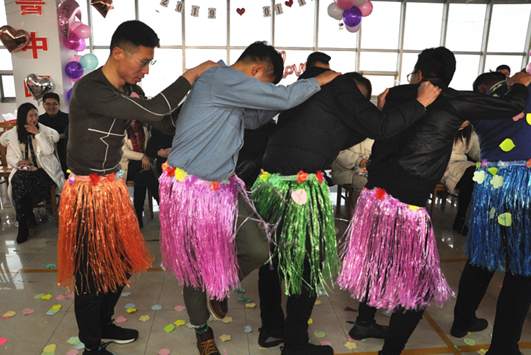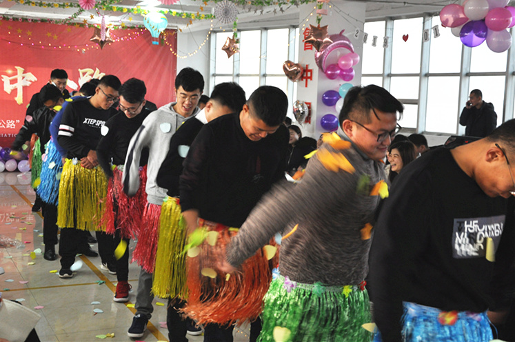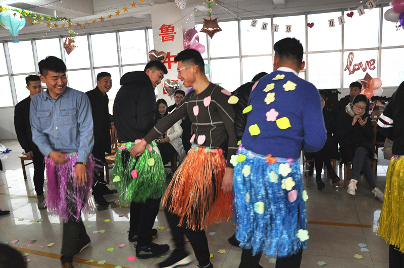 一個個游戲下來,聰明能干、呆萌踏實的小伙子們已經打動了姑娘們的芳心,但魯中公路小伙子的身上不僅僅只有這些亮點,還有幽默、豁達、鮮活的另一面。隨著主持人的指令,手掌互動的小游戲選出了需要被懲罰的人。小伙子們主動請纓替女生受罰,身著草裙的他們開始“舞動人生”。婀娜的舞姿、妖嬈的步伐引來全場的陣陣笑聲,把整個會場氣氛推向高潮。