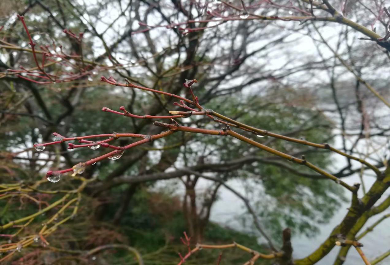 你看,在這溫暖的江南,也是會有一些花草樹木凋零,以他們自己的方式表達(dá)著對這四季輪回的尊重。雨后的枝丫總掛著一些調(diào)皮的水滴,不肯落下,沒了葉片的樹枝有著簡單的線條,再有這水珠的靈動,也讓人甚是喜歡。
