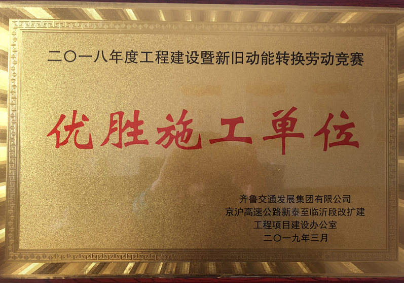 2019年3月9日,京滬臨沂項(xiàng)目辦舉行2019年加快工程建設(shè)暨“春季百日大干”動(dòng)員大會(huì)上,表彰了2018年涌現(xiàn)出的先進(jìn)單位和先進(jìn)個(gè)人,山東魯中公路建設(shè)有限公司作為京滬高速公路建設(shè)的排頭兵,一直兢兢業(yè)業(yè),恪盡職守,嚴(yán)格按照公司部署,執(zhí)行公司決定,堅(jiān)定不移、不打折扣地落實(shí),發(fā)揚(yáng)魯中人吃苦耐勞,團(tuán)結(jié)協(xié)作的精神,樹立敢闖敢拼,廢寢忘食的先進(jìn)典型,以點(diǎn)帶面,共同進(jìn)步。