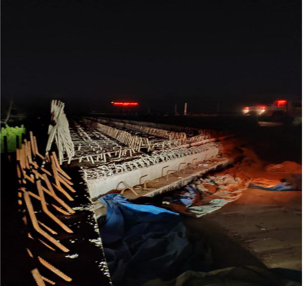 2019年4月1日,京滬高速公路萊蕪樞紐至臨沂(魯蘇界)主線(K477+442.25-K710+180)段實(shí)行交通封閉,封閉期間,改擴(kuò)建區(qū)域內(nèi)所有上跨主線橋全部拆除,我部借此有利時(shí)機(jī),抓重點(diǎn)、搶時(shí)機(jī),短時(shí)間內(nèi)借助高速封閉,在高速上直接進(jìn)行梁板安裝施工,大大節(jié)約了時(shí)間,成本,降低施工難度,隨后我部對(duì)跨河道橋梁梁板進(jìn)行了重點(diǎn)梳理,最終確定把K696+847.765柳溝河西支中橋、K697+079.838小橋梁板吊裝作為本次封閉期間重點(diǎn)工作,利用這短暫寶貴的封閉時(shí)間,我部先對(duì)現(xiàn)場(chǎng)人員按進(jìn)行了安全技術(shù)交底,然后機(jī)械設(shè)備緊鑼密鼓地趕至施工現(xiàn)場(chǎng)并迅速展開梁板安裝施工,并且經(jīng)過一天的奮戰(zhàn),終于完成了柳溝河西支中橋左幅的全部梁板安裝任務(wù)。