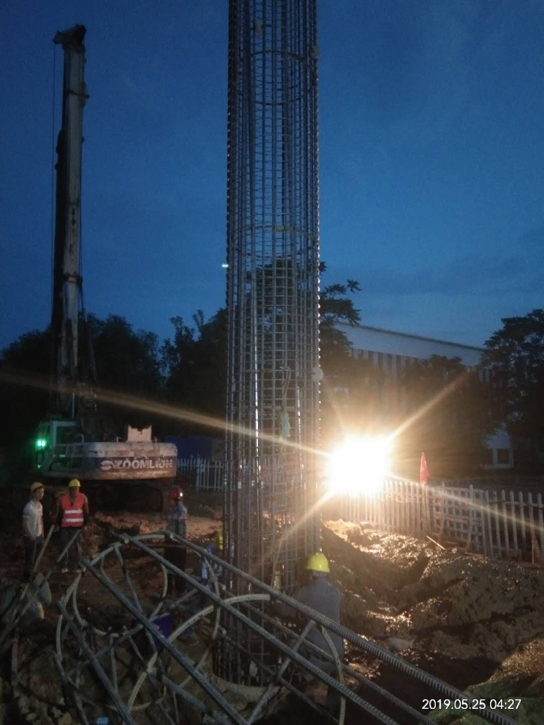 剛開工時,老城區(qū)地下管線錯綜復(fù)雜,探溝開挖困難重重。澇淄河橋下電纜、國防、污水、雨水更是相互交錯,現(xiàn)場一探再探,設(shè)計變更一變再變,歷時將近一個月。因工程在城區(qū)中心,東二路交通難以封閉,項目部多次與監(jiān)理、業(yè)主以及交警溝通封閉交通方案,考慮了種種因素未能成功實施。在這種情況下,由于工期緊、任務(wù)重,運輸車只能夜晚裝車外運,澇淄河橋只能夜深人靜,車流量、人流量稀少的時候進行樁基施工,現(xiàn)場人員連續(xù)一個多月夜晚加班至凌晨。