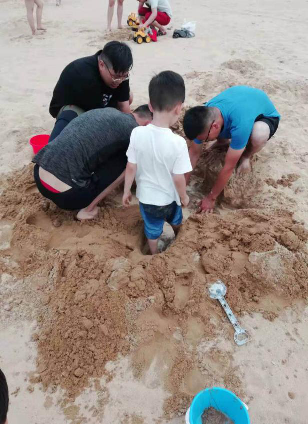 參觀完工地后組織員工與孩子們?nèi)ノ牟碁┥先ネ嫠?,孩子們看到沙灘和湖水便興沖沖的拉著爸爸媽媽去玩耍,有的在湖里面和新結(jié)交的好朋友打水仗,有的小朋友在沙灘上堆沙堡,有的小朋友索性沙灘上一躺,很是愜意。玩耍完畢后是團(tuán)圓水餃的活動,由家庭與孩子們一起包水餃,孩子們活潑俏皮的參與其中,弄得臉上變成了小花貓。