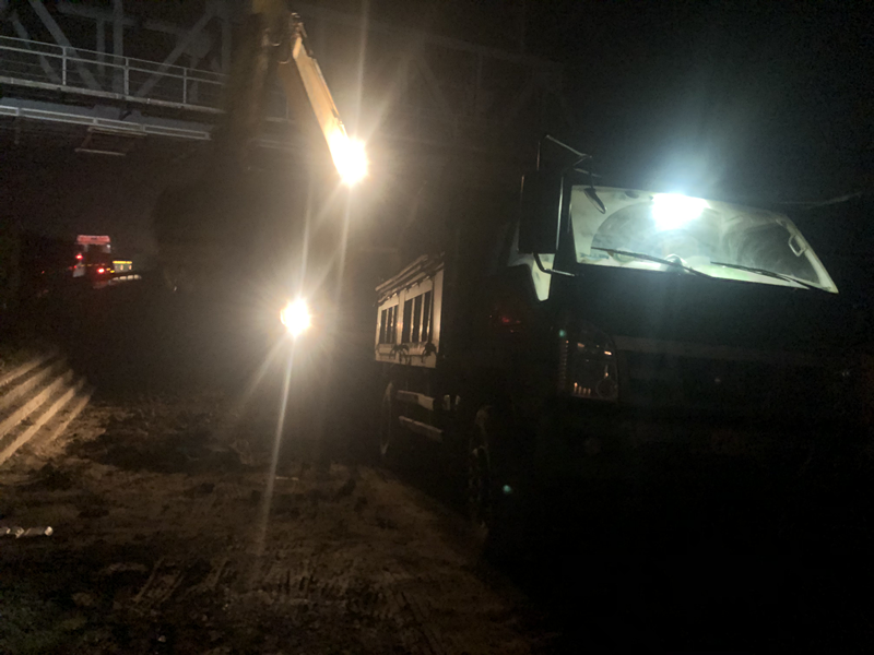 凌晨2:00膠新鐵路樁基現(xiàn)場(chǎng)還在渣土外運(yùn)