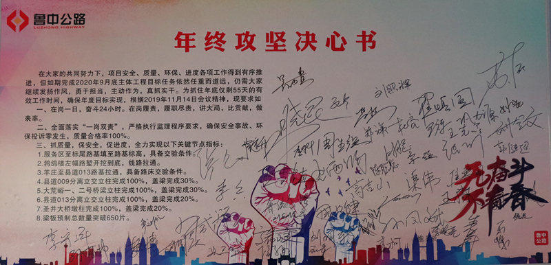 2019年11月15日,青蘭項(xiàng)目部全體干部員工在《年終攻堅(jiān)決心書(shū)》上莊嚴(yán)地簽下了自己的名字。