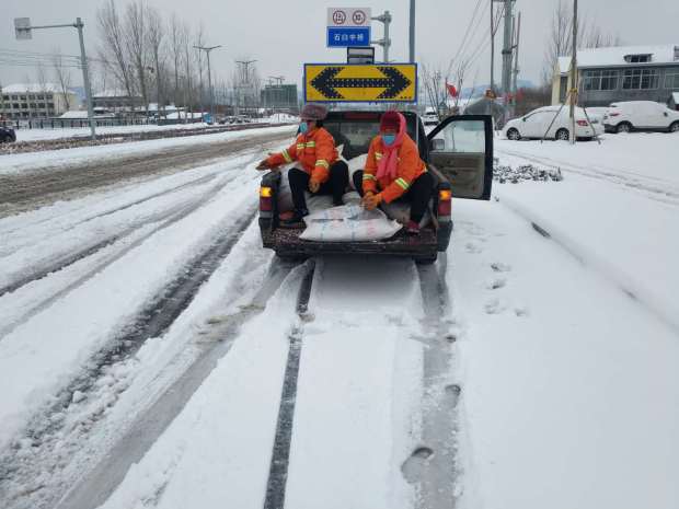 在沂源縣人民路項(xiàng)目部隔離的我們?yōu)榱私煌ò踩殖伤慕M對(duì)沂源縣人民路進(jìn)行除雪作業(yè)。首先出門(mén)前對(duì)人員進(jìn)行了分工和安全交底,每個(gè)人必須戴口罩、消毒、穿反光衣和注意保暖。兩組人員負(fù)責(zé)對(duì)路面撒融雪劑,一組人員進(jìn)行安全巡視,一組人員負(fù)責(zé)對(duì)大平交路口進(jìn)行除雪。由于疫情原因路上車(chē)流量較少,加快了我們除雪的速度。在雪白的道路上我們的反光衣顯得格外耀眼,在寒風(fēng)中浴“雪”奮戰(zhàn),奮力的鏟除路上的積雪。大家干得熱火朝天,身上都冒汗了,腳上的鞋也濕透了,為了保障市民出行方便、安全,他們顧不得這些,不間斷地清掃著。
