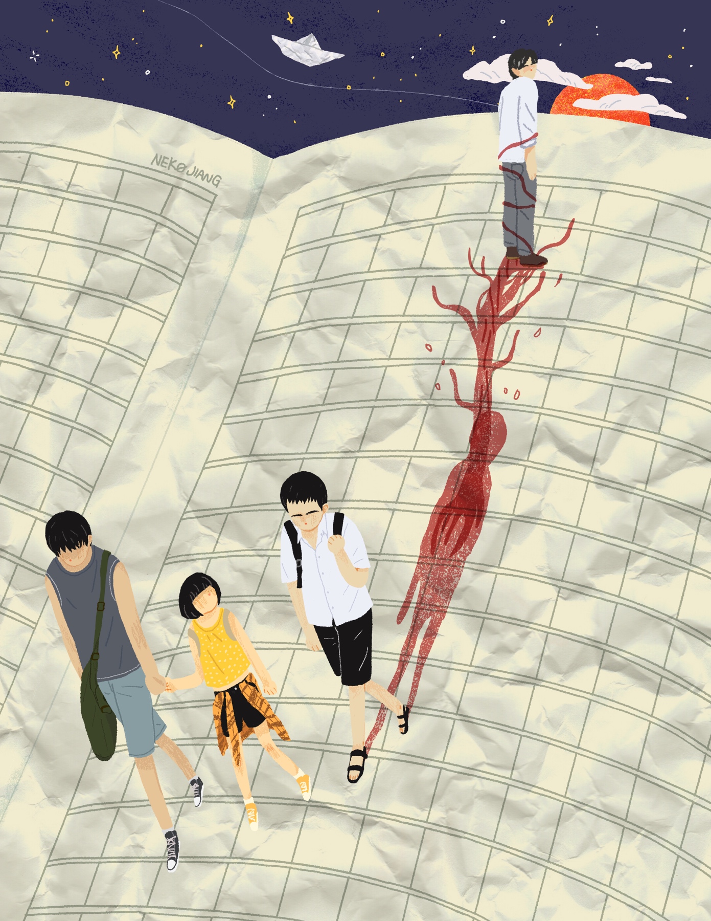 小說(shuō)開(kāi)篇即是張東升在妻子出軌決議離婚之后,在隱忍了一年,計(jì)劃了一年時(shí),毫不猶豫的將自己的岳父母從山上推了下去。本來(lái)這會(huì)是一場(chǎng)完美犯罪,缺意外的被三個(gè)游玩的小孩子錄到了視頻中。朱朝陽(yáng)本想報(bào)警,卻被普普阻止,她想勒索張東升,用勒索到的錢(qián)和丁浩成長(zhǎng)到成年。在這時(shí),朱朝陽(yáng)還是一個(gè)規(guī)規(guī)矩矩的乖孩子,轉(zhuǎn)折點(diǎn)發(fā)生在意外殺死朱晶晶之后。為避免其他兩個(gè)人將他殺人的事情說(shuō)出去,只能同意勒索之事,這是朱朝陽(yáng)邁向黑暗的第一步,之后的事情更加不受控制:要挾張東升將自己父親和后媽殺害;為盡早繼承遺產(chǎn)挖出尸體的一角;在明知道張東升要?dú)⑺雷约汉突锇槿藭r(shí),袖手旁觀,最終獨(dú)自存活。推動(dòng)所有事件的朱朝陽(yáng),卻在最后憑借一本“長(zhǎng)高秘籍”和編造的日記本逃脫嫌疑,不得不敬佩這位少年的心智之高。