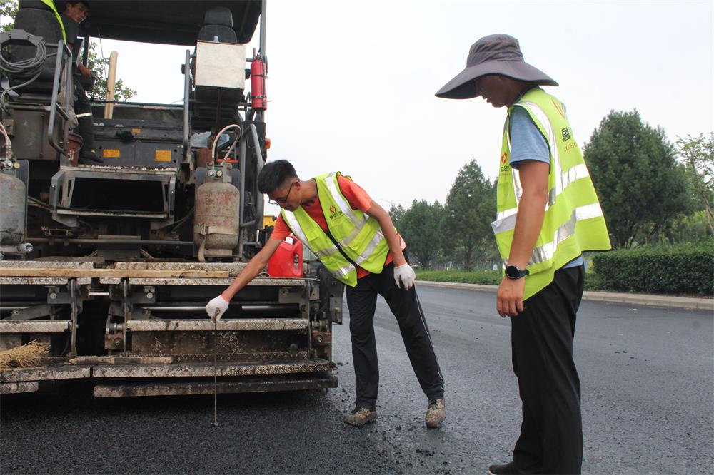 早晨天剛亮他們就已經從駐地出發(fā)了,炙熱的太陽下、火一樣的高溫,160度的瀝青料攤鋪現場,滾燙的瀝青混凝土上,看著一張張堅毅、樂觀的笑臉,一個個身著反光服的小伙子,伸手一摸衣服,竟然早被汗水濕透了,汗水滴到腳下,瞬間就沸騰揮發(fā)沒了,問一句:熱嗎?回答:熱,習慣了。就是簡短的一句,再無需多言!聯通路提升改造工程工期因大型社會活動,被人為縮短,工期時間雖緊質量卻不能放松,小伙子們的回答是:“上一個工程質量優(yōu)秀,這個工程質量必須超越上一個工程”。日復一日,高溫里他們依然在為了心中的目標堅持和堅守。