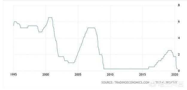 下面這張圖就是美國的基準(zhǔn)利率走勢圖,在2000年以前,美國的利率基本都在5%以上,后來出了個(gè)互聯(lián)網(wǎng)泡沫,對經(jīng)濟(jì)影響比較大,為了拉動(dòng)經(jīng)濟(jì)發(fā)展,美聯(lián)儲開始快速的將利率降低到了1%附近,一直持續(xù)到2005年。