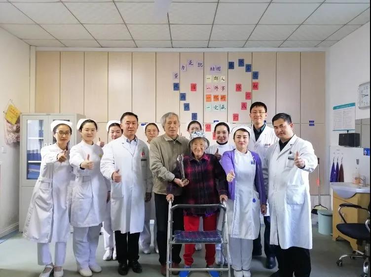 回到病房,奶奶吸上氧,帶上監(jiān)測設(shè)備,我的奶奶一切指標(biāo)都正常,鄰床的阿姨手術(shù)后都狀況頻出,可我的奶奶卻安祥如初,奶奶還聲音洪亮的和護(hù)士說:“謝謝你們,我沒事,你們快去休息吧。”術(shù)后第二天,引流管拔除后,奶奶就在醫(yī)生和護(hù)士的陪同下嘗試下床站立行走了。從此,奶奶每天堅持下床行走,還央求著醫(yī)生護(hù)士,讓她盡量多走一段路。奶奶用她的實際行動感染了身邊的醫(yī)護(hù)人員,其他科室的醫(yī)生也都來探望這位堅強(qiáng)的老人,他們還自發(fā)給奶奶做了個獎杯,祝我奶奶健康長壽?!遏斨谐繄蟆返弥?,也在第一時間采訪了我奶奶,就這樣,一傳十,十傳百,原本傳統(tǒng)中本命年渡劫的奶奶卻成了淄博市醫(yī)療系統(tǒng)當(dāng)紅的明星。