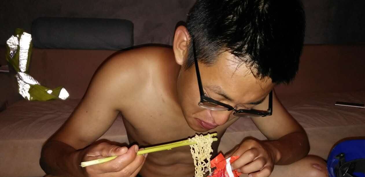 泡面的故事發(fā)生在橋隧工程分公司沂源橋梁項目6月中旬的樁基澆筑混凝土施工現(xiàn)場。當晚王立超負責混凝土澆筑觀測工作,枯燥但卻要求有高強度的責任心,一站站一晚,崗在那人就得在那,容不得半點分心。工作完成卻已是深夜時間,原本想干啃方便面的他,看到地上剛巧有干凈的樹枝,就立馬撅了變成了一次性筷子,頭上的安全帽也派上了用場,就著袋子裝上熱水,一古腦的成就了這頓豐盛的夜宵。
