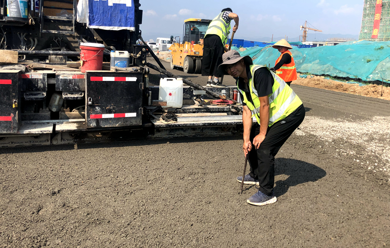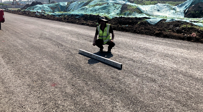 攤鋪過程中,現(xiàn)場質檢人員隨時檢查松鋪厚度,以保證結構層厚度;碾壓階段,采取“先邊后中”、“先輕后重”的施工原則,并及時檢測水穩(wěn)混合料的含水量及水泥劑量;碾壓完成后,由項目現(xiàn)場質檢人員對高程、橫坡、寬度、平整度及壓實度進行檢測,嚴格控制施工質量。