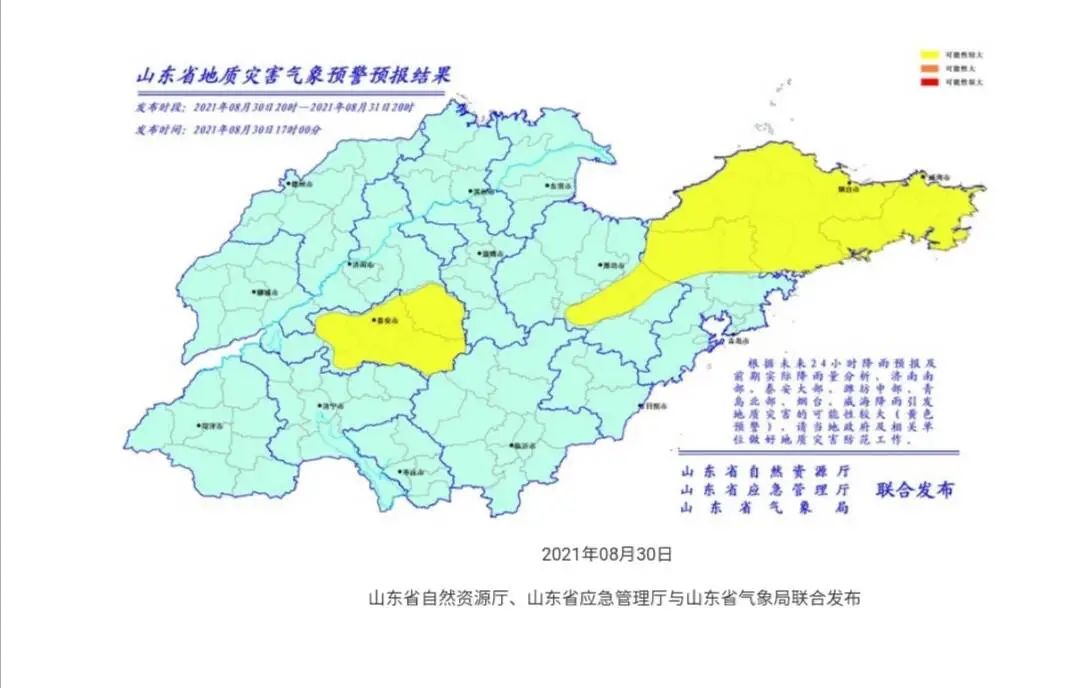 山東省自然資源廳、山東省應(yīng)急管理廳和山東省氣象局8月30日17時聯(lián)合發(fā)布地質(zhì)災(zāi)害氣象風(fēng)險(xiǎn)預(yù)警:根據(jù)未來24小時降雨預(yù)報(bào)及前期實(shí)際降雨量分析,濟(jì)南南部、泰安大部、濰坊中部、青島北部、煙臺、威海降雨引發(fā)地質(zhì)災(zāi)害的可能性較大(黃色預(yù)警),請當(dāng)?shù)卣跋嚓P(guān)單位做好地質(zhì)災(zāi)害防范工作。