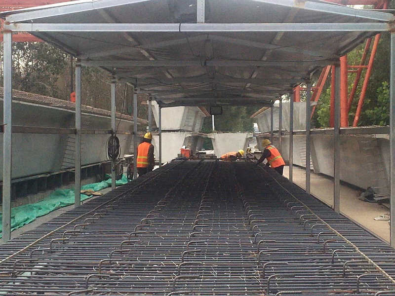 為保證橋面鋪裝砼施工質(zhì)量,增強(qiáng)預(yù)制場(chǎng)箱梁與現(xiàn)澆橋面鋪裝砼的拉結(jié)力,使二者共同受力,延長(zhǎng)橋跨結(jié)構(gòu)的使用壽命,圖紙?jiān)O(shè)計(jì)了預(yù)制箱梁頂板鋼筋預(yù)留[形N20鋼筋,與橋面板橫向鋼筋對(duì)應(yīng)綁扎,縱橋向每間隔50cm布置一組,一共5組,一片30米箱梁頂板要布置300根,全部點(diǎn)焊連接。