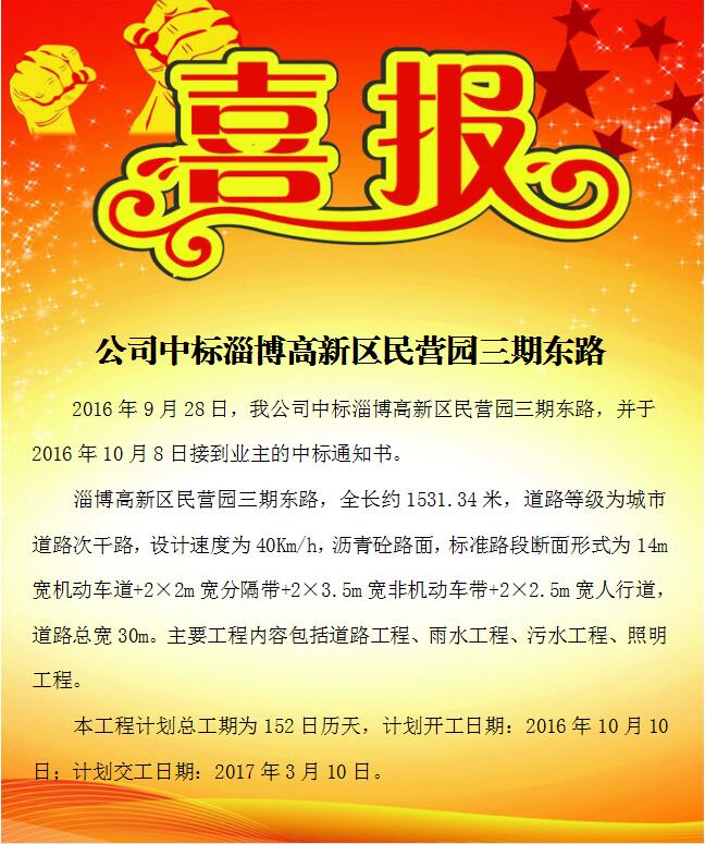 公司中標(biāo)淄博高新區(qū)民營園三期東路